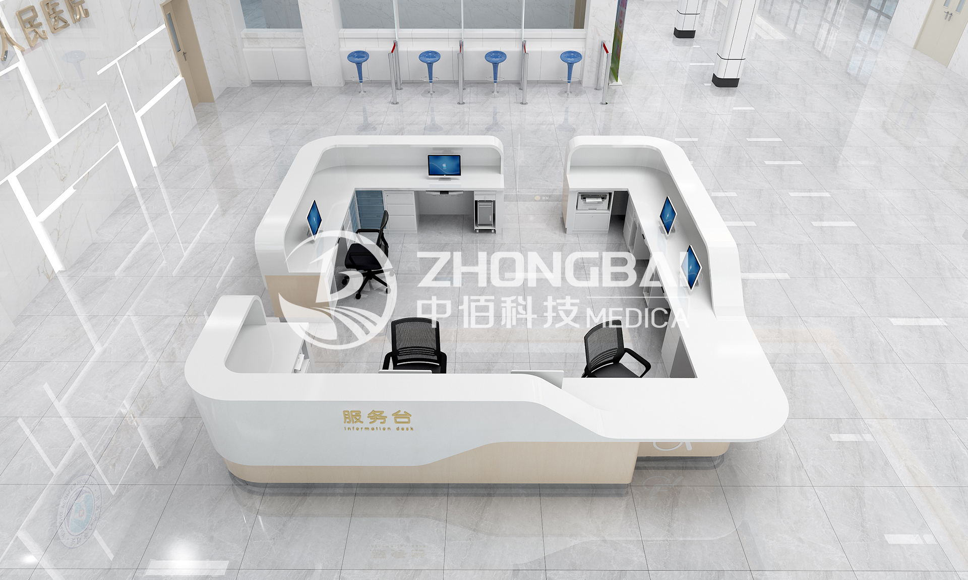 親切優雅是設計服務臺的宗旨,力求其與環境相融合,讓醫務工作者及周邊的人群感到踏實溫暖;設計新穎大方、布局合理使用。